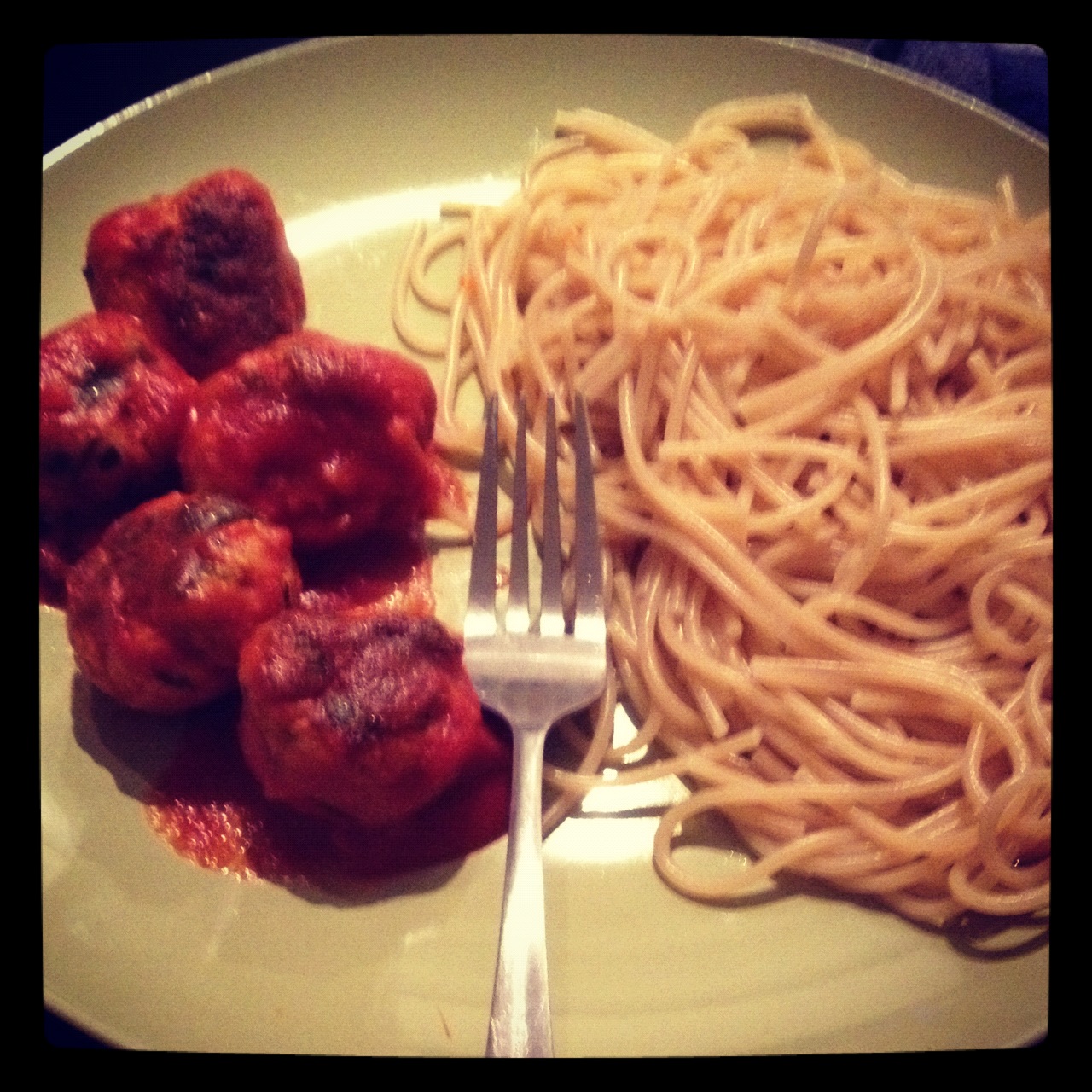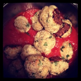 Then plate, serve, and enjoy these tasty (and pretty healthy) meatballs!  Below is Jay’s version and mine: