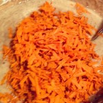 Now grate up those carrots! This is by far the worst part but it pays off! Once the carrots are grated mix the carrots, pineapple, and nuts into the egg/flour mixture..