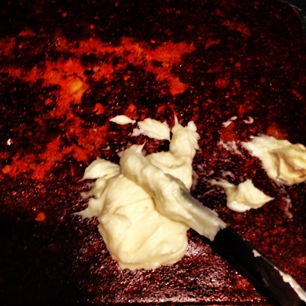 Go ahead and leave out the cream cheese and butter while the cake cooks so it can soften. Wait patiently…drink wine…yum…