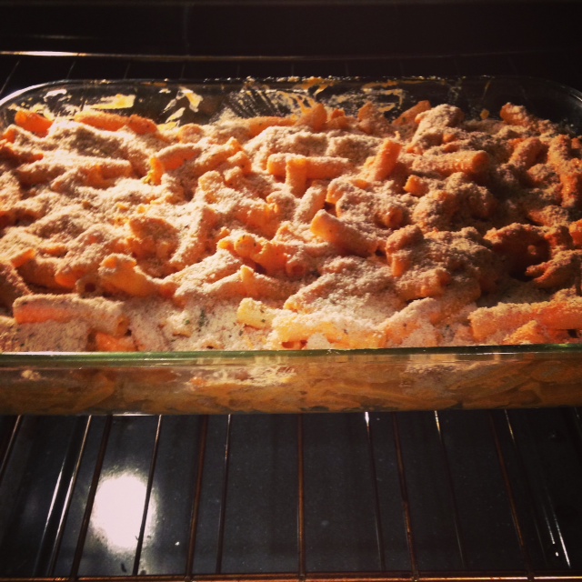 4. Once everything is all mixed up, spread in a glass baking pan and top with the breadcrumbs and parm (I pre-mixed the crumbs and cheese).