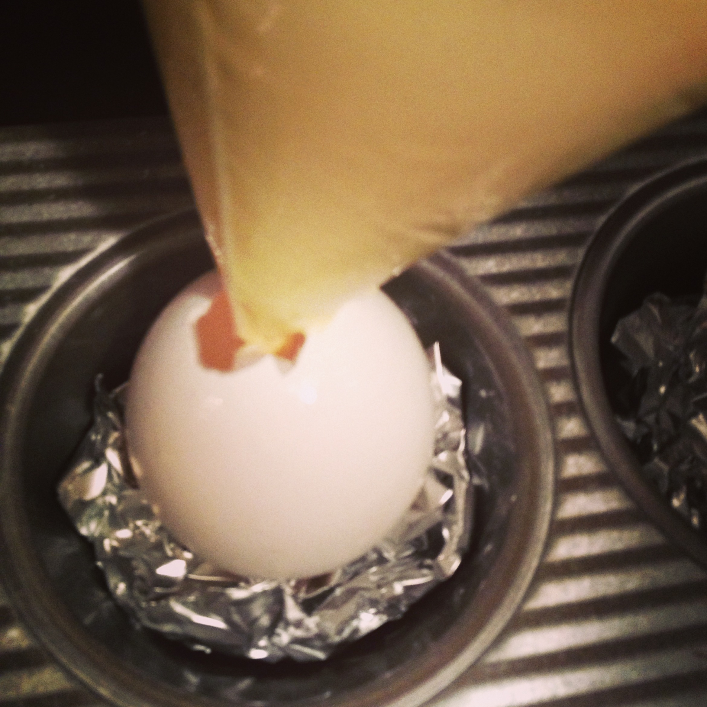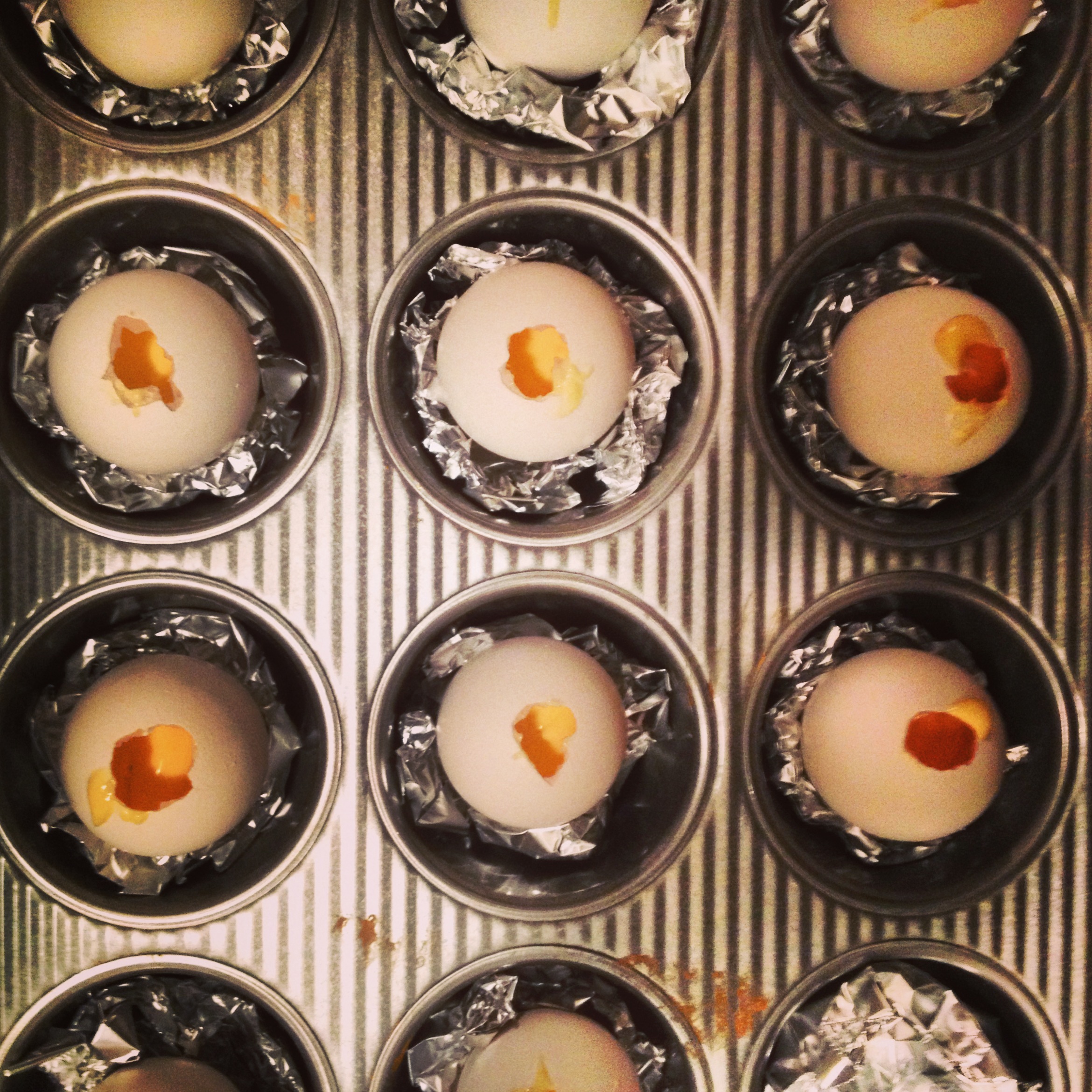 7. Fill those eggs up and place them in a cupcake tray.  I used some foil to hold them upright and into place…