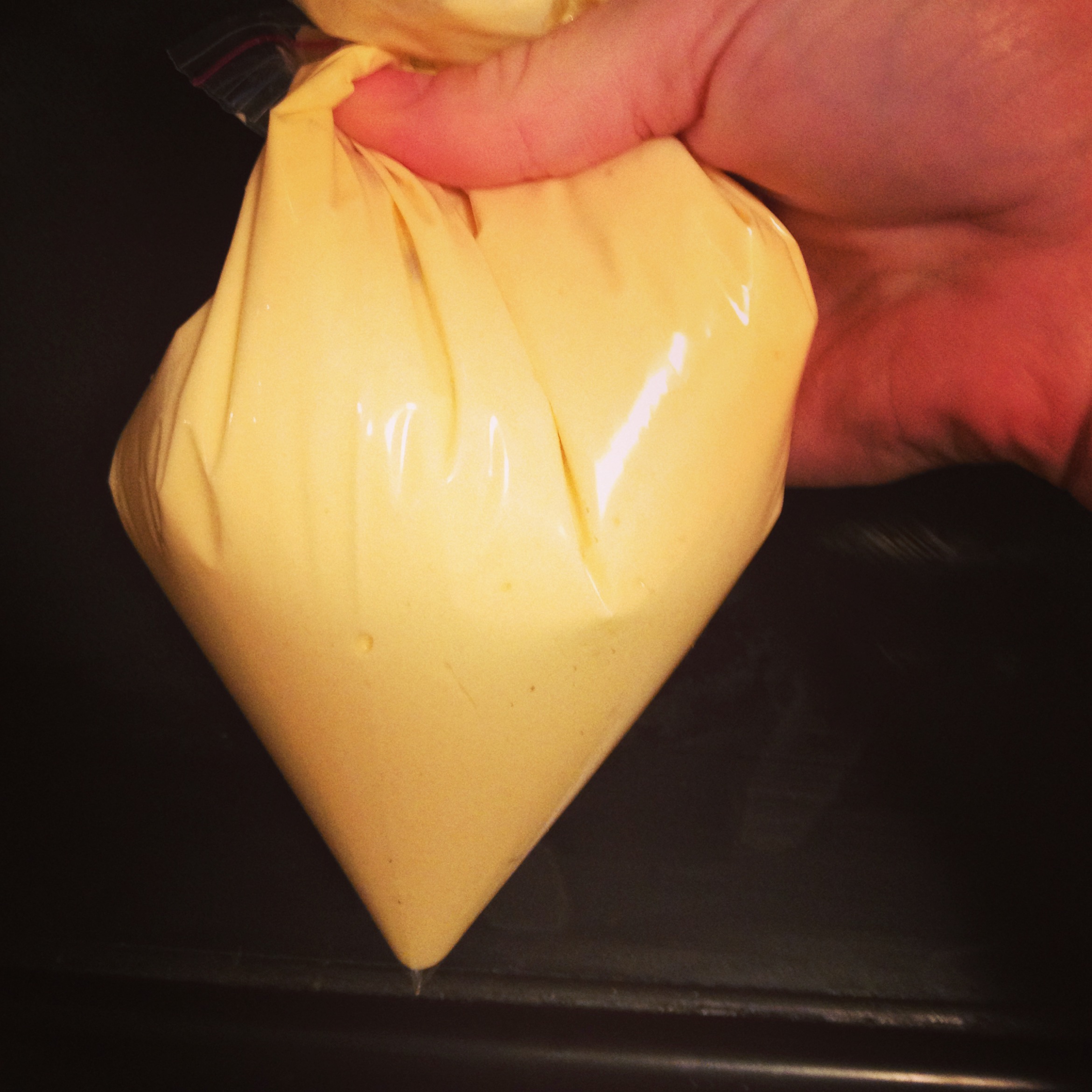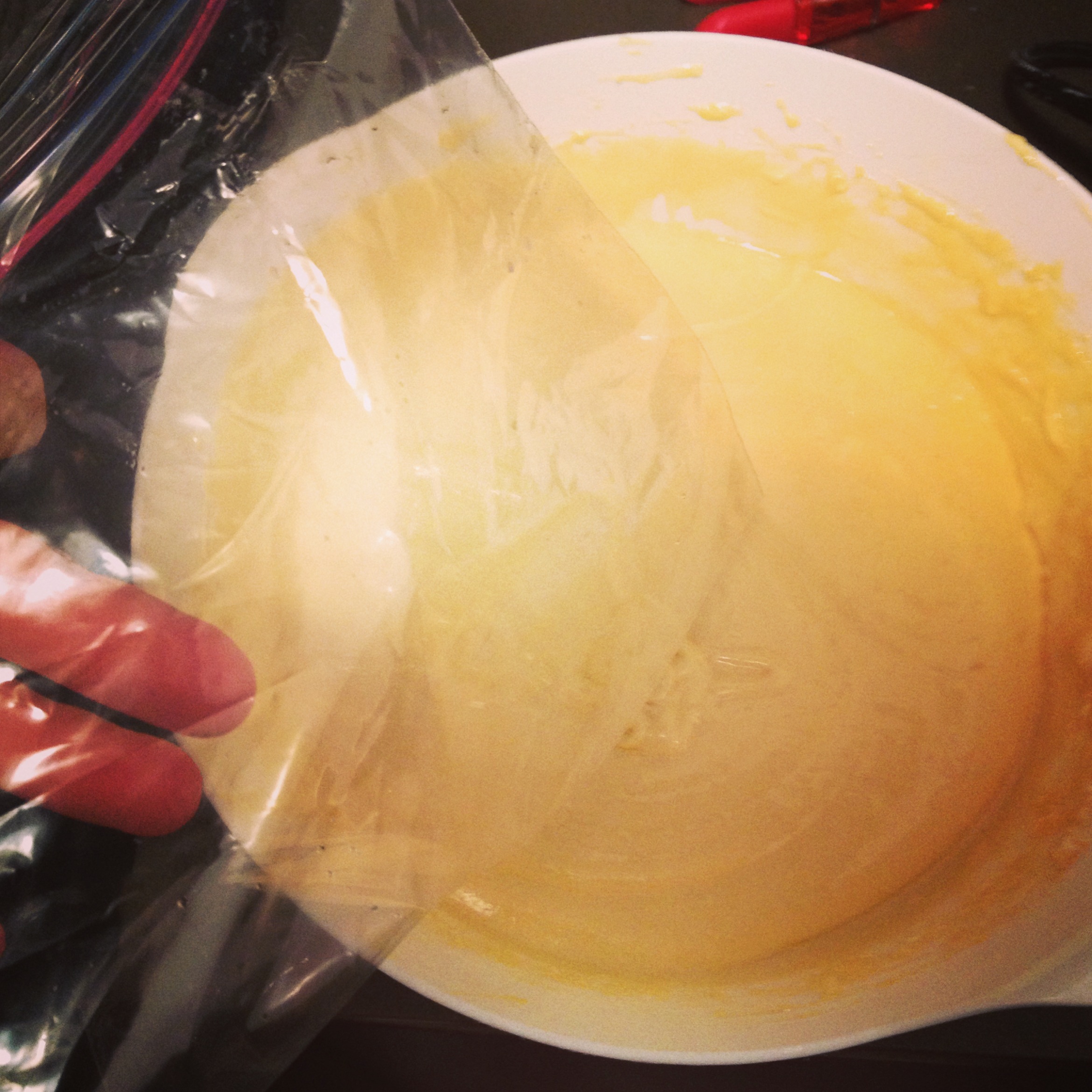 6. Pour the batter into a plastic bag and cut a small hole in the tip of the bag…this will be your egg filler!
