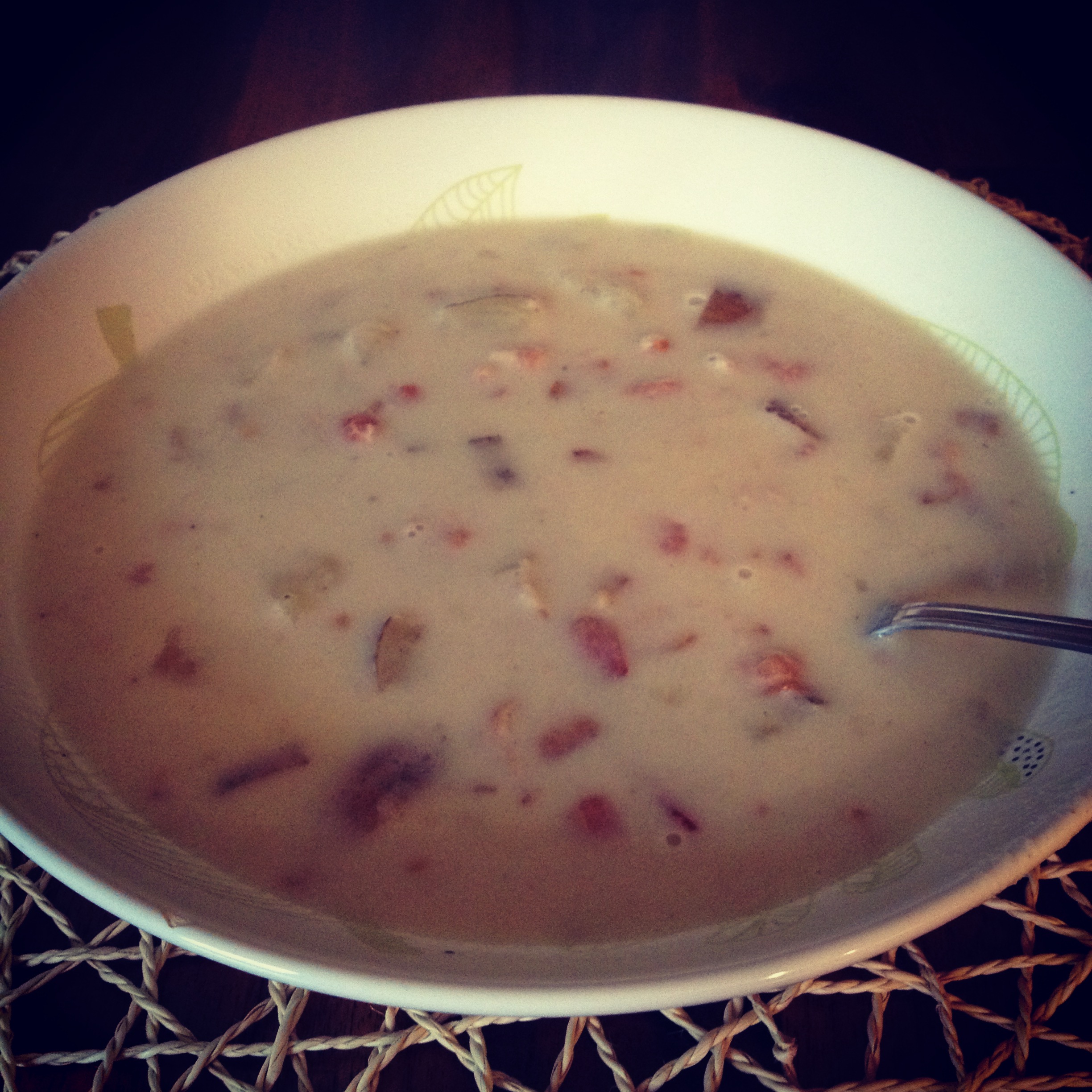 Since it’s started to get cold here I keep having cravings for soup.  Anyone who has ever met Jay knows he is obsessed with soup (it’s weird) so it works out when I get the urge to try out a new one! This weekend, while Reggie was visiting (!!), I decided to try out a clam chowder crock pot recipe, and oh man, so good.  I did make some changes to the recipe and thought I would share what I did…
