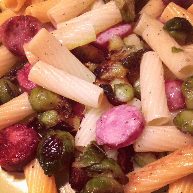 We eat chicken sausage probably once a week.  They are so delicious, and not SO horrible for you!  How I have never combined my bizarre love of Brussel sprouts and sausages before I don’t know.  The hardest part of this recipe is chopping the sprouts, seriously. Anyways, wanted to share another simple one that ends up really really tasty!